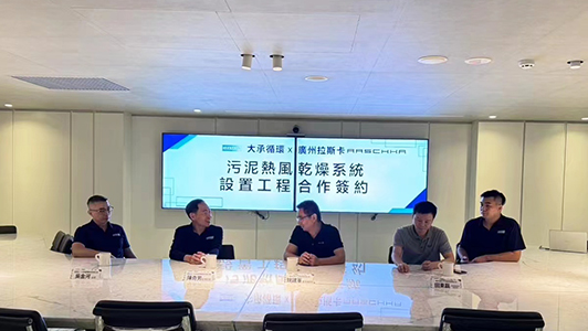 4月23日上午,拉斯卡工程与大承循环股份有限公司就污泥热风干燥系统设置工程签订了合作协议。该污泥干燥设置工程位于台湾高雄,系统处理规模为100吨/天(污泥含水量为67.5%)。大承循环副总经理陈奇男先生等领导、拉斯卡工程董事总经理姚建军先生、危废事业部总经理田东磊先生参加了签约仪式。
